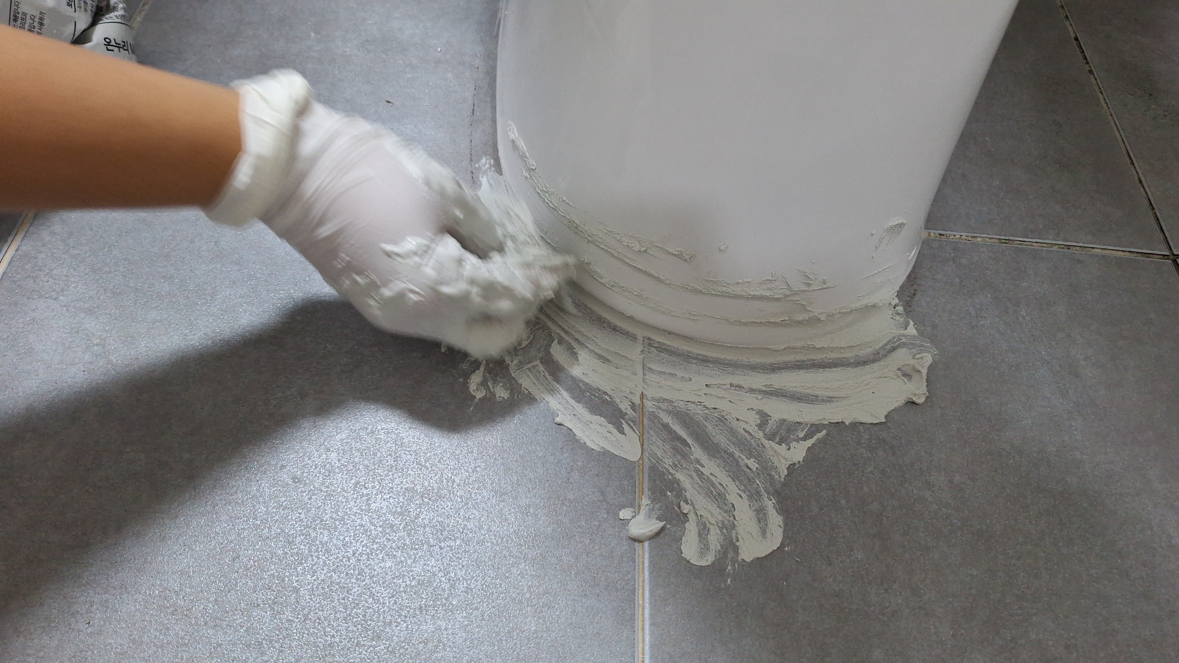 윗부분에 말씀드린 니트릴 장갑을 끼고 한줌 쥐고 변기 아래쪽을 채워넣으면서 발라줬어요