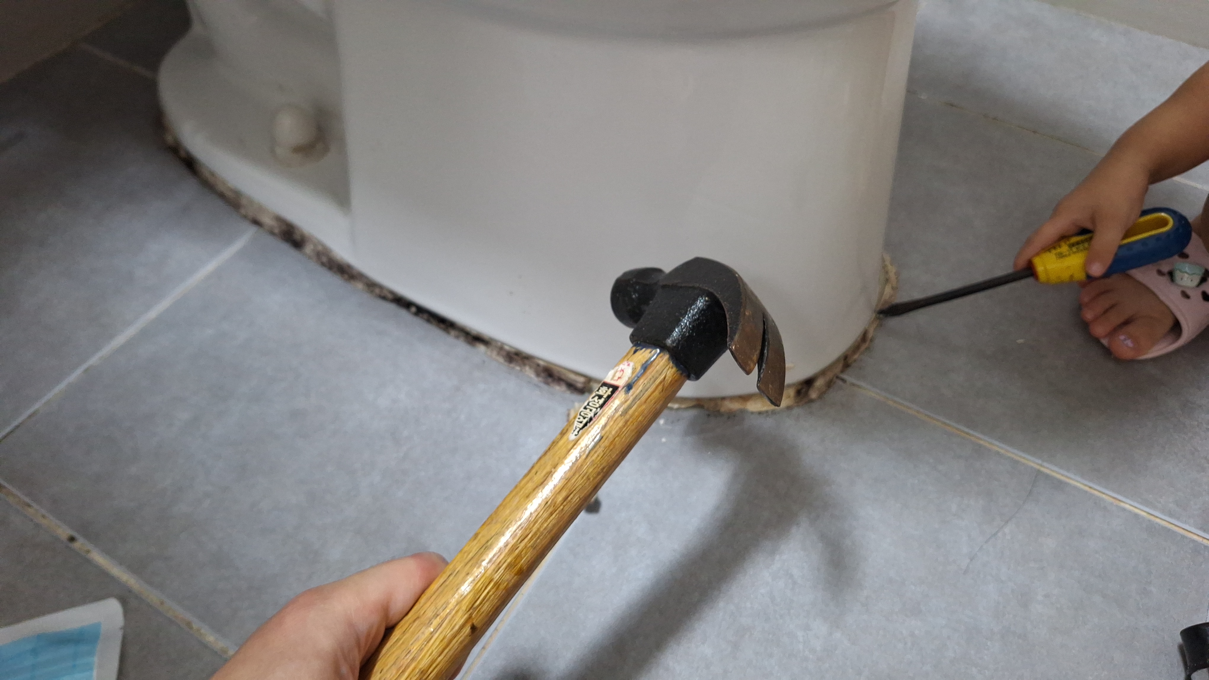 변기는 건드리지 마시고 망치와 드라이버가 있다면 톡톡톡 쳐주면 알아서 잘 깨집니다.